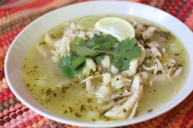 Serve the pozole garnished with cilantro, sliced radishes and jalapeno, avocado, and lime wedges.