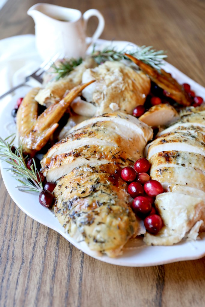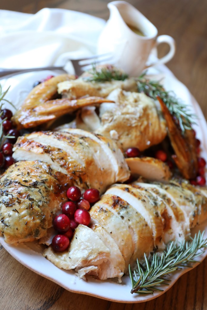 It’s that time of year again, families across America will be serving this bird to celebrate thankfulness and togetherness. Some look forward to this experience, some lean more towards the alternative meat option, ham. Inevitably, amateur and experienced cooks alike will work very hard to perfectly roast a turkey for their guests, and will over-cook it, leading to a dry and sad piece of poultry. I prefer breast meat which tends to be the first to dry out. This recipe is a turkey game changer for me as it turned out perfectly moist and flavorful in all the right ways. I was so impressed how easy it was to create and turned out like I slaved over it for hours. This recipe does not require brining your bird for days in advance, or repeatedly basting throughout the cooking process. If you want a fool-proof crowd-pleasing recipe, this is for you!